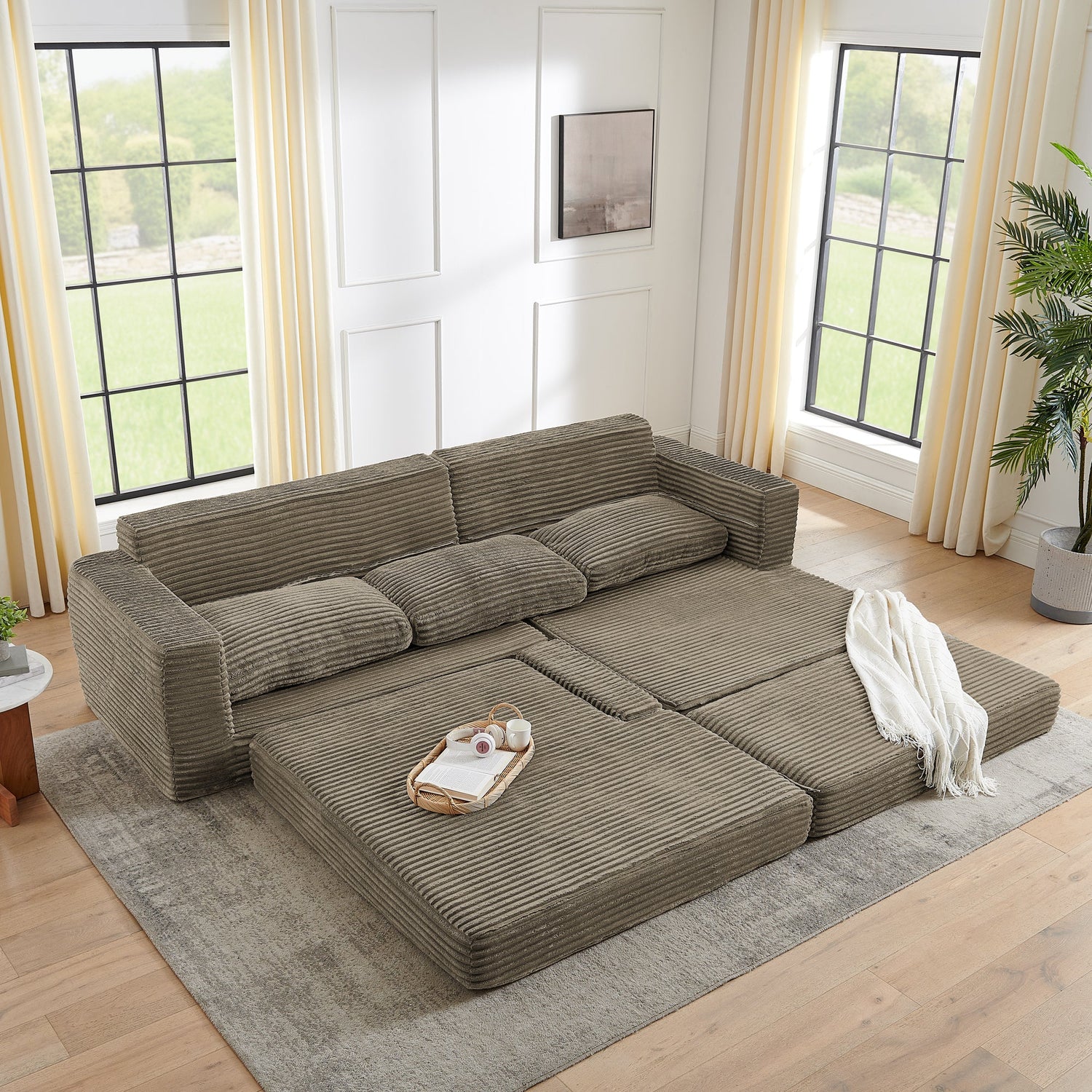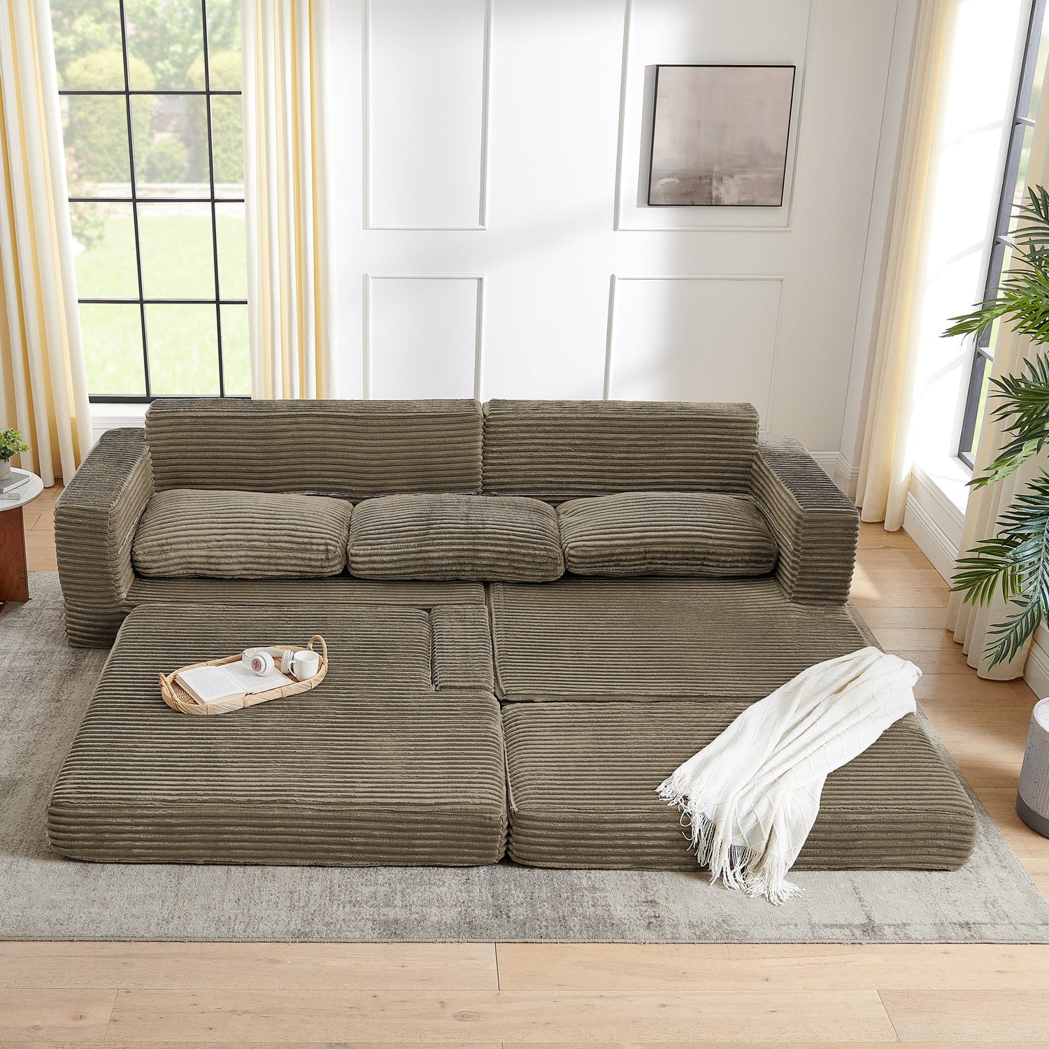 This sofa brings extra sleeping space and attractive style to your living room. It has wider armrests and backrests that can accommodate a lot of guests, can be converted into a variety of shapes, and can self-assemble into a bed, which is very convenient and suitable for overnight stays. Wrapped in a soft, skin-friendly flannelette fabric interior, this sofa is completely filled with foam, and the seat is filled with foam and supported by springs to help prevent the sofa from sagging over time. This upholstered sofa features square armrests. No wood frame construction, no assembly required, very friendly to elderly children.