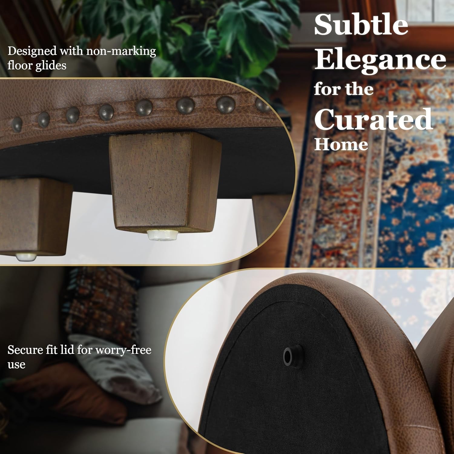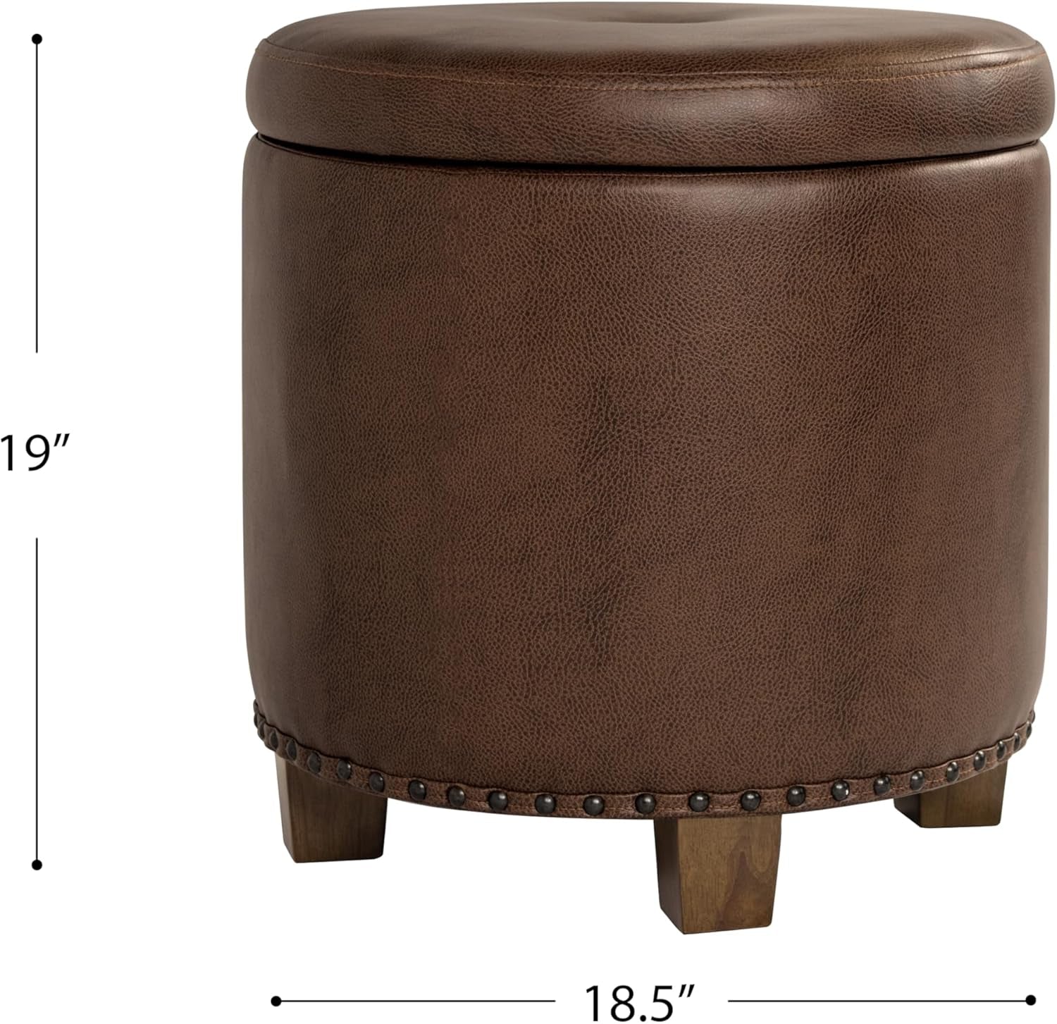 Elevate your living space with a round storage ottoman that combines luxurious brown faux leather, timeless nailhead trim, and hidden storage—delivering style and function in one compact piece.