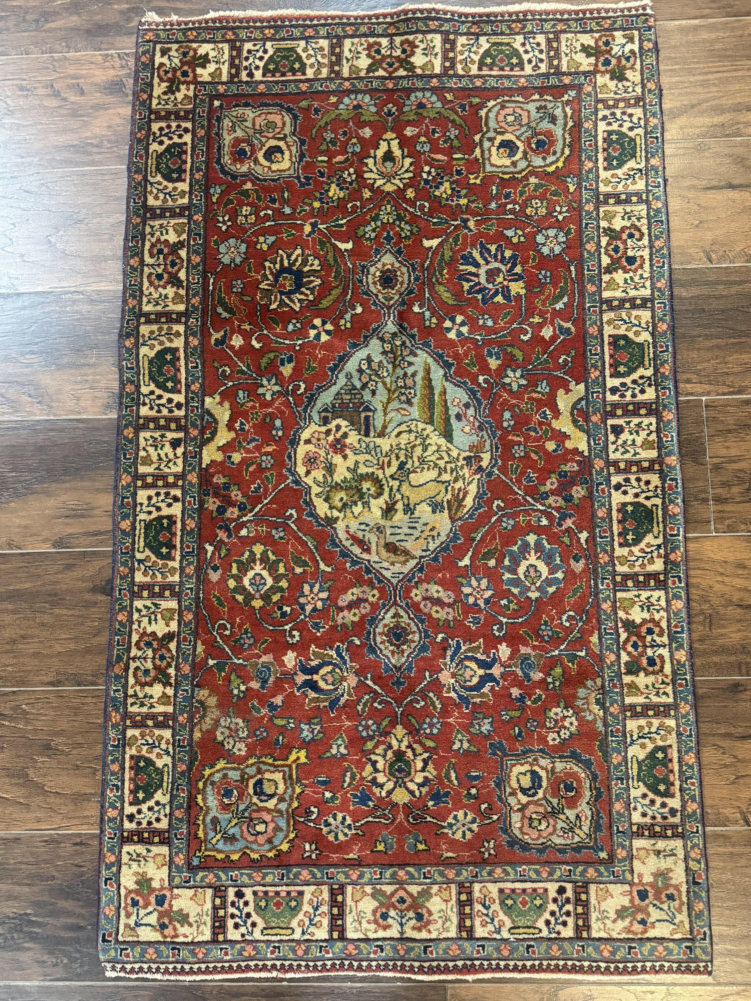 USED Small Persian Tabriz Rug 2.8 x 4.7, Red, Animal Pictorials, Semi Antique Vintage