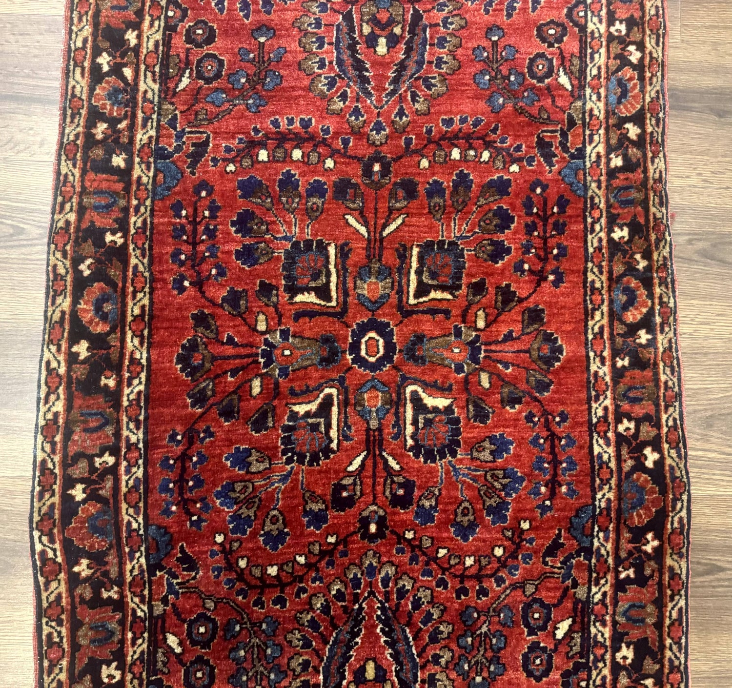 This small antique Persian Sarouk rug measures 2'7" x 4'9" and features a beautifully composed floral pattern on a deep red field. The intricate central medallion is flanked by layered palmettes and stylized flower heads in midnight blue, ivory, and soft gold accents. The balanced symmetry and strong outlining are typical of early 20th-century Sarouk weaving, and the weave density of approximately 170 KPSI contributes to the precision of its detailing. Ideal for use in an entryway, office, or reading nook, this rug brings a refined elegance and a touch of old-world charm to smaller interiors.