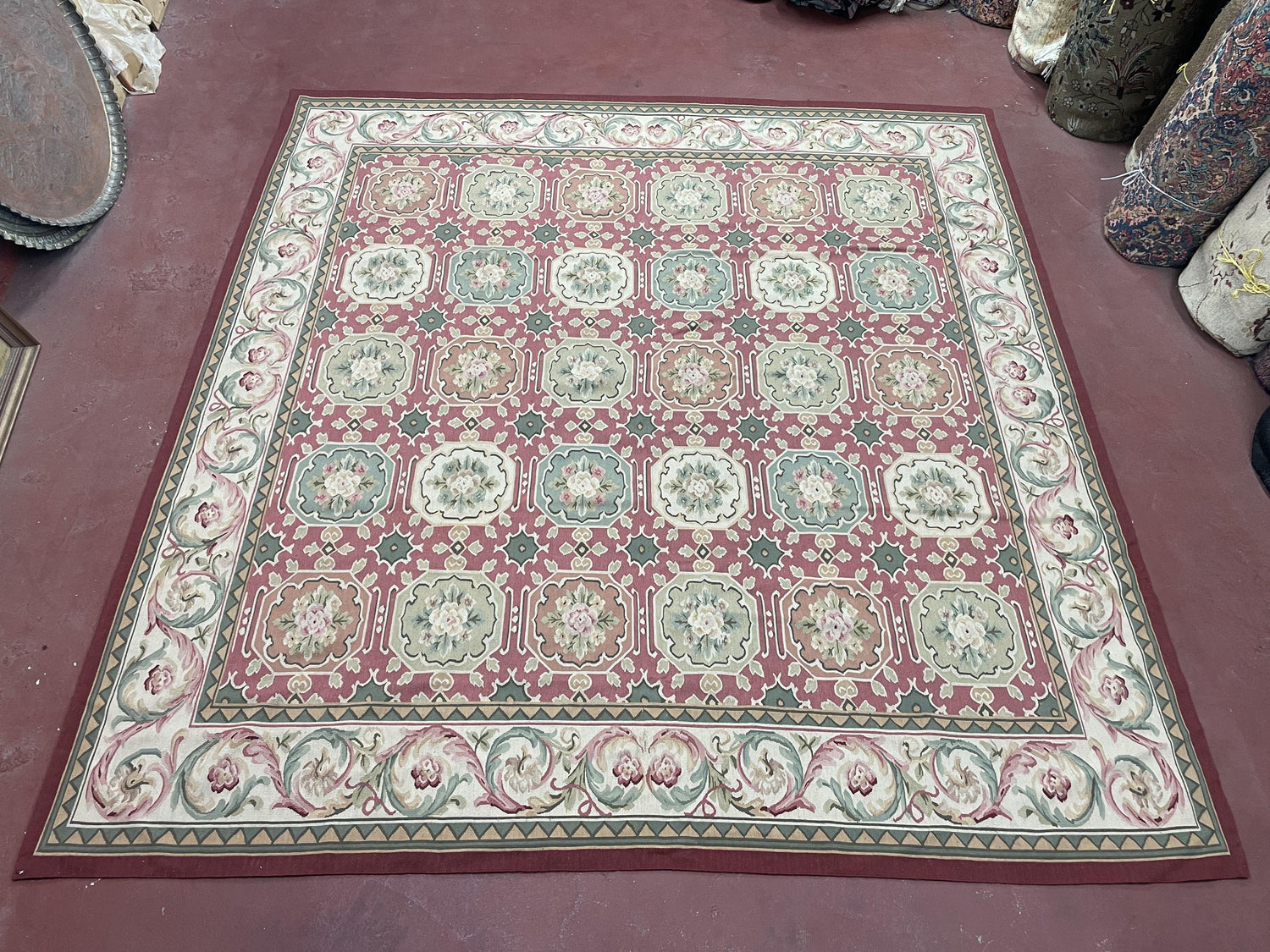 USED Square Aubusson Rug 9x9, Panel Design, European French English Carpet, Wool