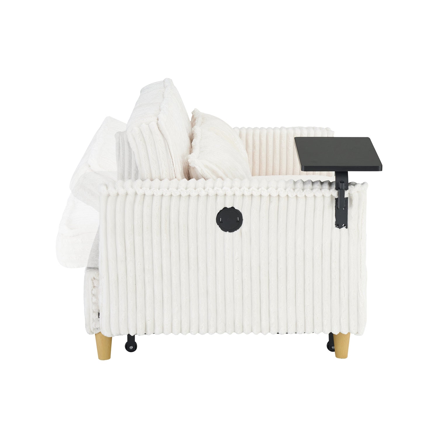 NEW Pull-out Push-in Beige Corduroy Sofa with Dual Functions Movable Tabletop and USB Ports