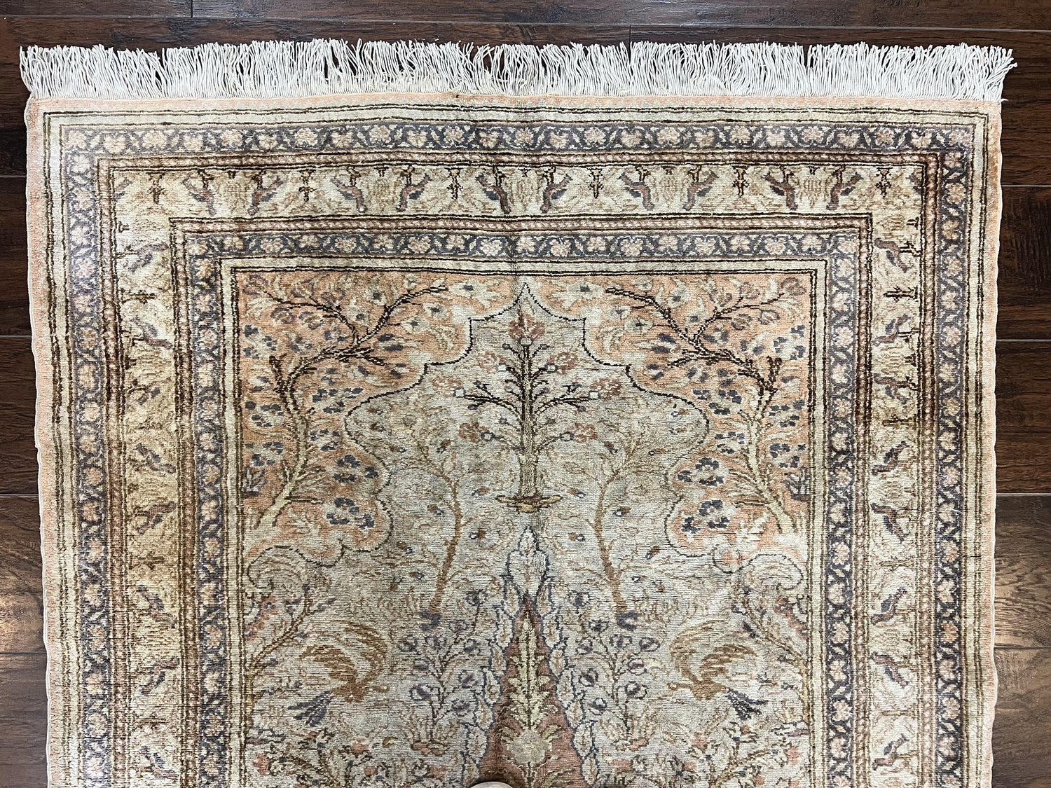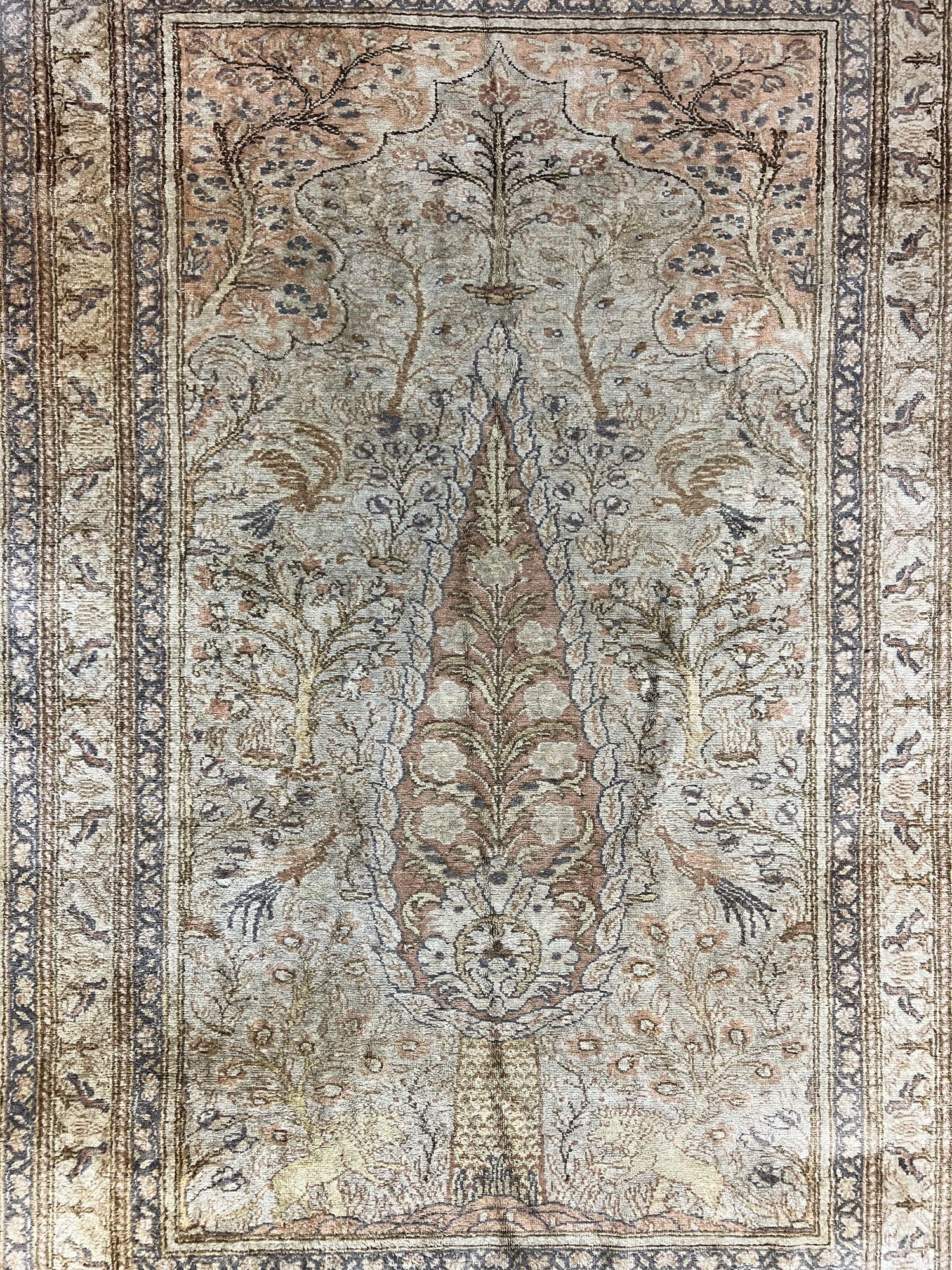 USED Turkish Kayseri Silk Rug 4x6, Tree of Life Pattern, Vintage Handmade Hand Knotted Carpet, Animal Pictorials, Birds