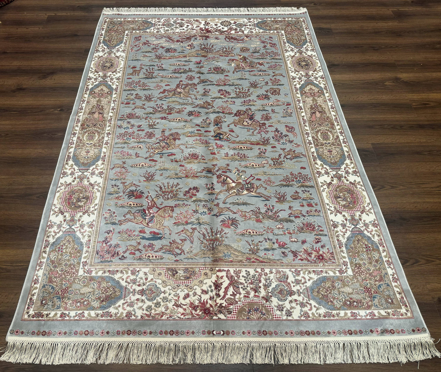 USED Turkish Silk Rug 5x7, Hunting Design, Animal Pictorials, Bamboo Silk