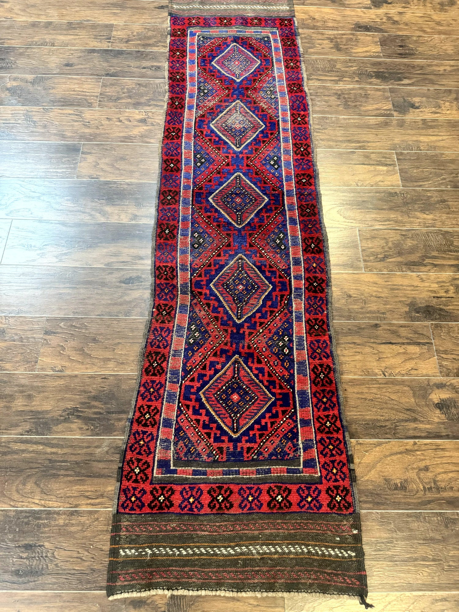 USED Turkoman Runner Rug 2 x 8.6, Skinny Runner, Handmade Wool Carpet for Hallway, Red and Blue, Wool, Vintage 8ft Runner