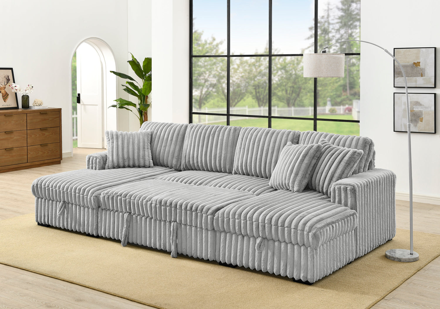 NEW Rabbit Plush Grey Corduroy Fabric Oversized Pull Out U Shaped Sleeper Sectional Sofa Bed Couch with Double Storage Chaise