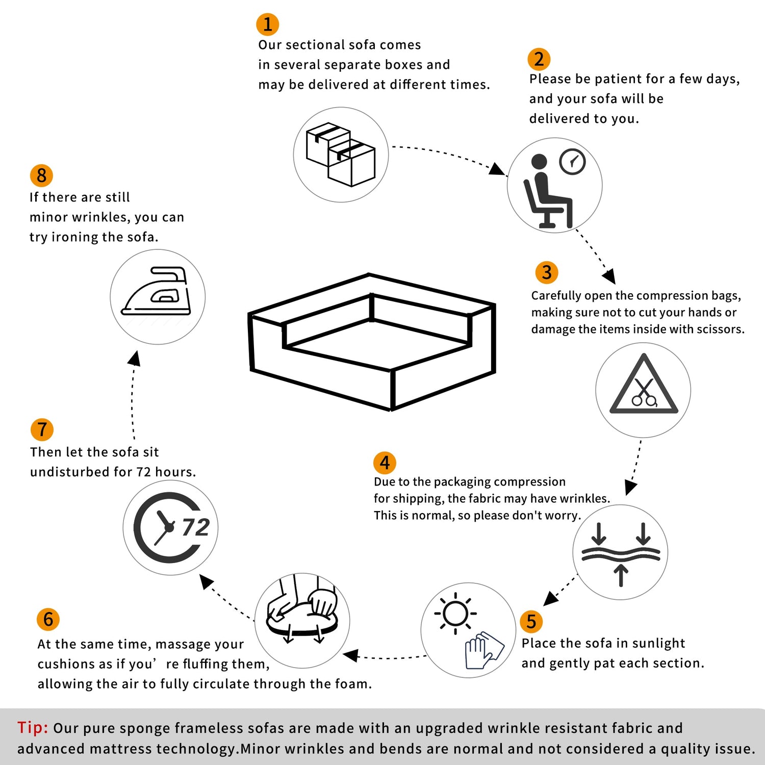 | TIP 2 | Due to package compression for better shipment, the fabric may have wrinkles. Please take all packages out and pat every part to make it rebound better and fluffy, so that it can restore to picture-like status. |
