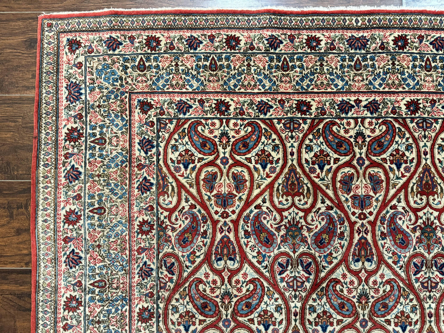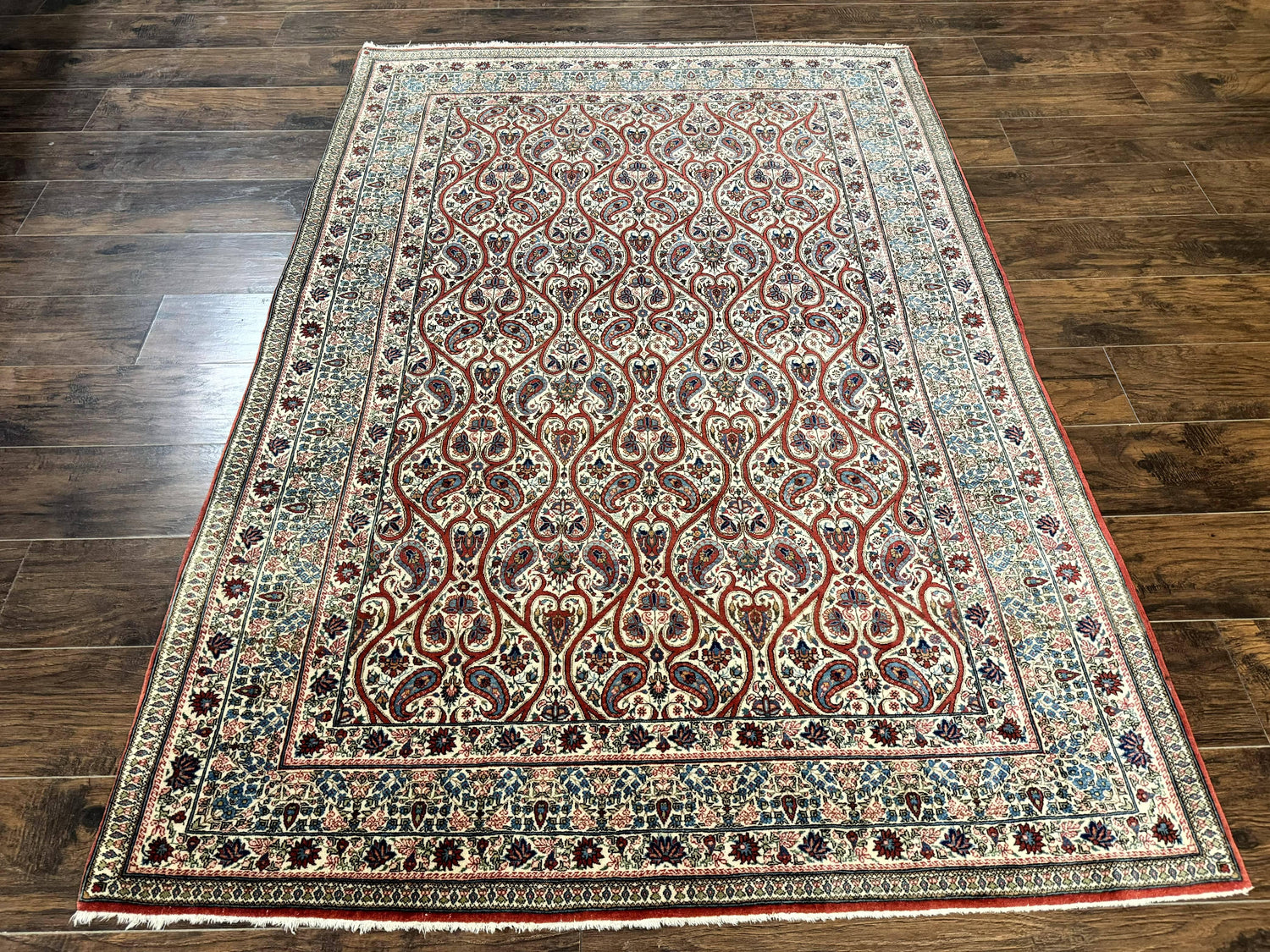 USED Unique Persian Qum Rug 5x7, Repeated Paisely Boteh Design, Ivory Red Blue, Handmade Antique Wool Persian Carpet, Finely Hand Knotted
