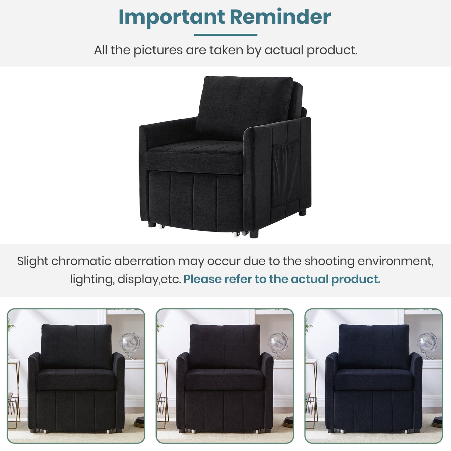 This versatile sofa is designed to meet a variety of needs with its multi-functional features. It effortlessly transforms from a comfortable seating chair to a reclining lounge chair, and can also be converted into a full single bed, making it a perfect solution for small spaces or accommodating guests. The backrest offers five adjustable recline positions, allowing you to find your ideal comfort level, whether you’re sitting upright or fully reclining. The sofa also includes convenient side pockets and a storage basket under the sofa bed for storage, keeping your space organized and clutter-free. Upholstered in soft and durable chenille fabric, it combines elegance with long-lasting comfort, making it a stylish and practical addition to any home.