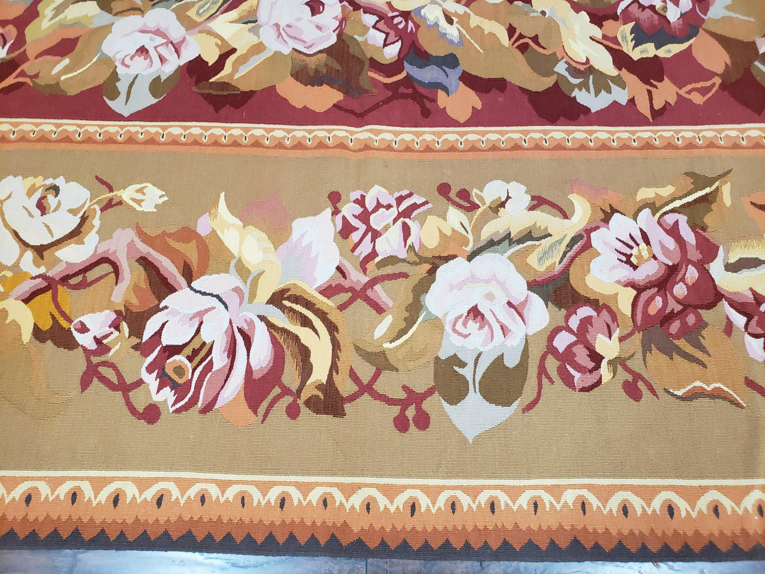 USED Vintage Chinese Aubusson Savonnerie Flat Pile Rug 9.9 x 14.5 Wool Handwoven Red & Khaki Large Flowers Rug 9x14 - 10x15 Michaelian Kolhberg