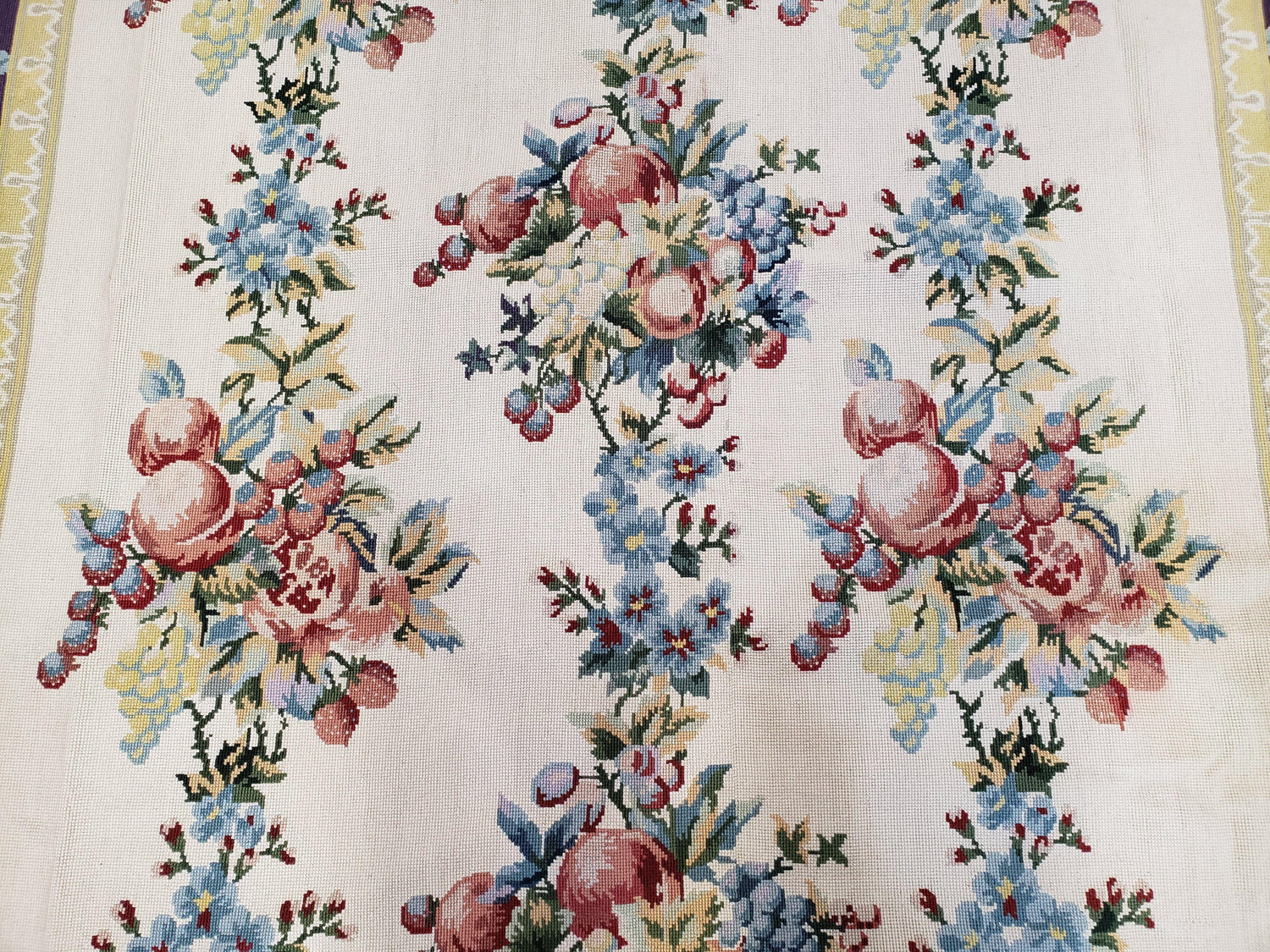 USED Vintage Chinese Floral Needlepoint Area Rug 6x9, Wool Hand-Woven Handmade Flatweave Rug, Ivory & Purple, Fruits Grapes Apples, Dining Room