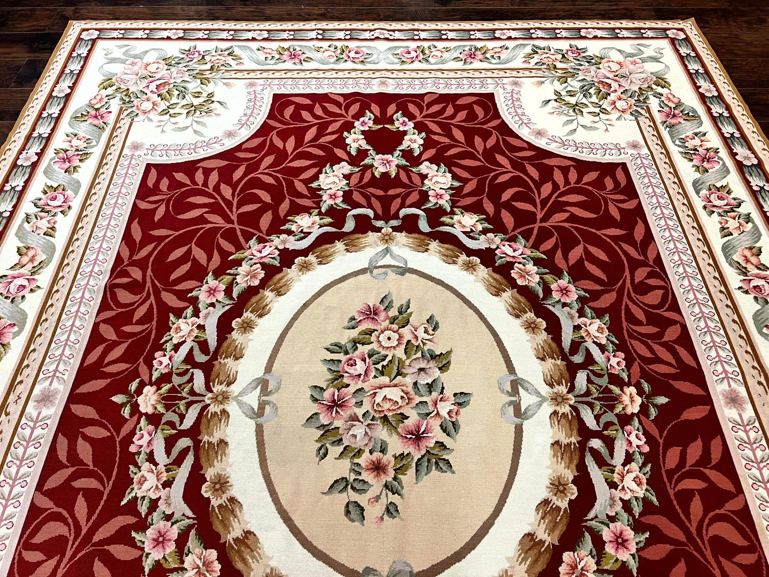 USED Wonderful Aubusson Rug 9x12, Handmade Vintage Needlepoint Carpet, Red and Ivory, Elegant European Design, Wool