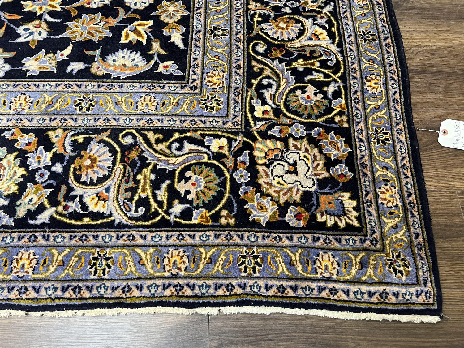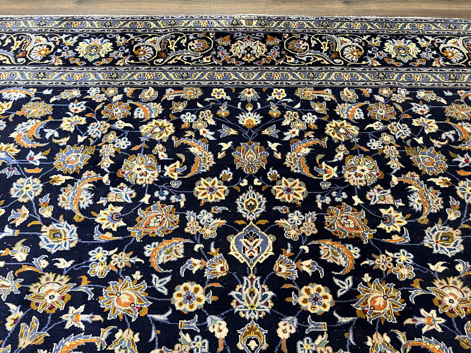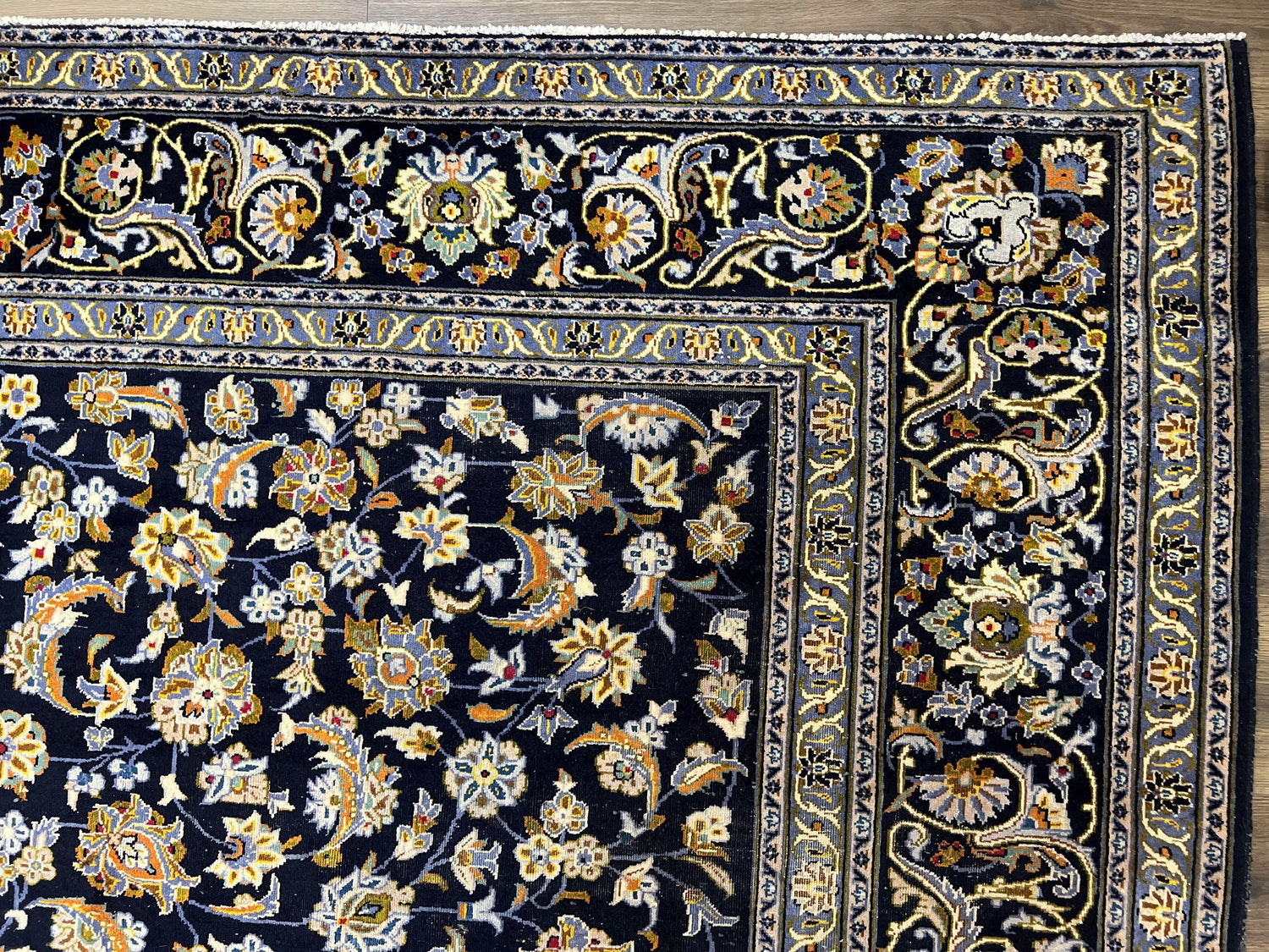 USED Wonderful Navy Blue Persian Kashan Rug 11x13, Allover Floral Design with Central Medallion, Wool Hand-Knotted Antique Carpet, Signed Rabani Rug