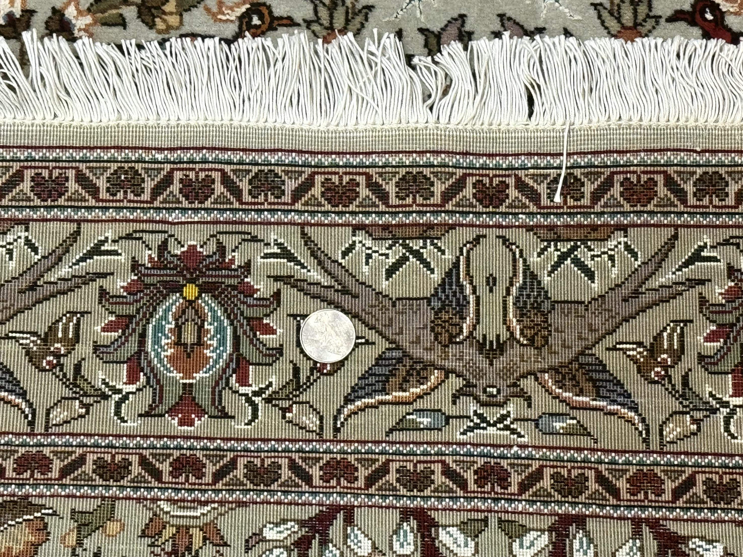 This finely woven Persian Tabriz rug measures 3'3" x 5' and showcases an elegant Tree of Life composition brought to life with a profusion of birds, deer, and other animal pictorials. The detailed symmetry of its branching motifs, framed by a lush floral border, speaks to the high technical skill involved—reflected in its impressive 330 KPSI knot density. Delicate silk highlights enhance the visual texture across the soft, mint-toned field, adding a gentle shimmer that changes with the light. A piece like this works beautifully as a decorative focal point or as a refined accent in a personal study or reading nook.