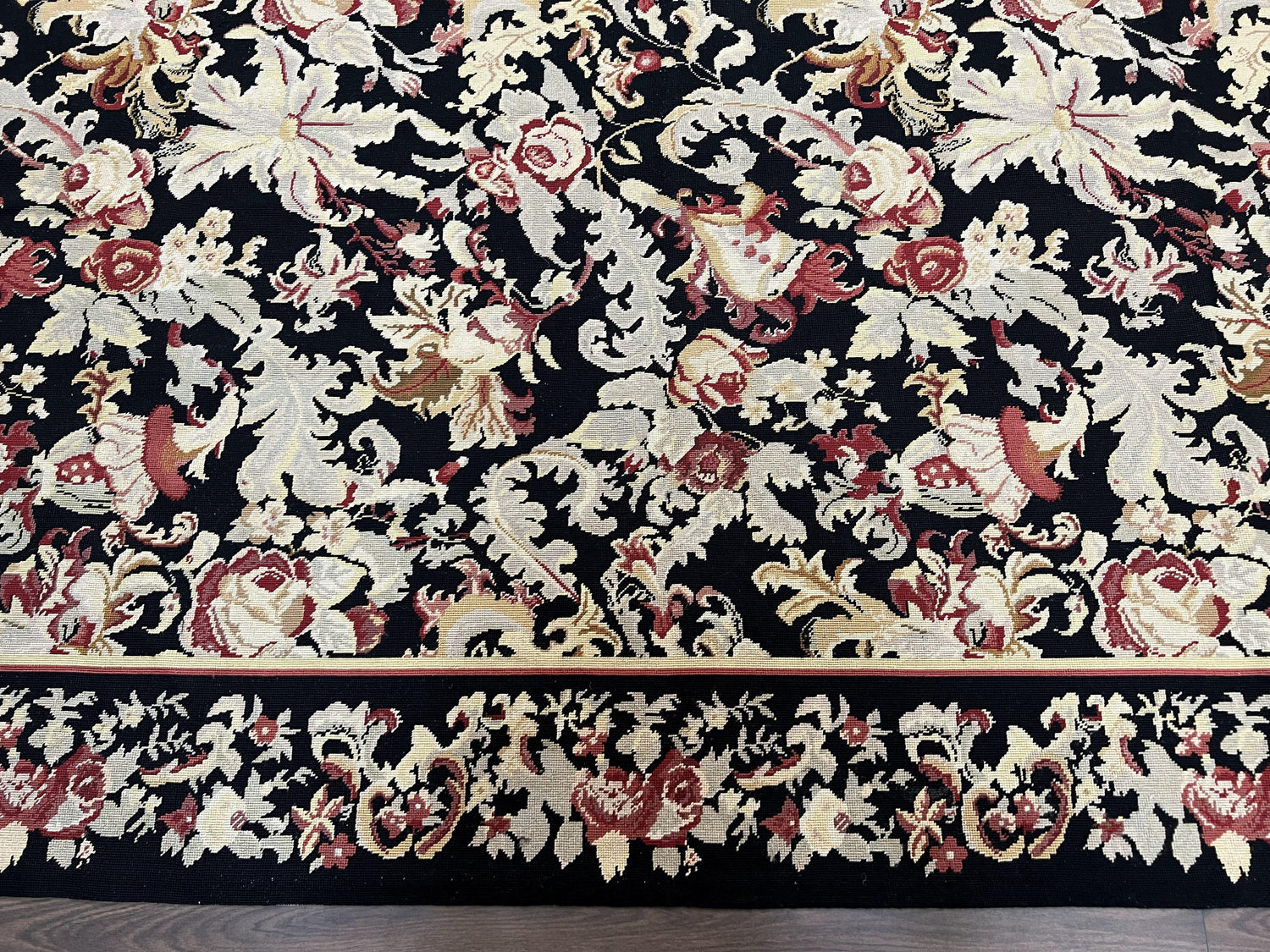USED Wool Needlepoint Rug 9x12, William Morris Vintage Chinese Needlepoint Carpet 9 x 12, Handwoven, Allover Floral Area Rug, Black Light Green